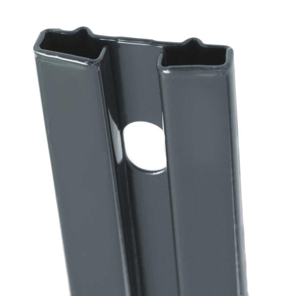 Abdeckleiste und Pfostenkappe (je 2 Stück) für den Zaunpfosten Typ P-Fix in der Farbe anthrazit. Die Abdeckleiste ist verzinkt und pulverbeschichtet, die Pfostenkappe aus Kunststoff. Die Abdeckleiste besitzt eine Länge von 1230 mm und hat fünf Befestigungspunkte. Die Abdeckleisten haben nach der Montage einen kleinen Überstand, der mit der mitgelieferten Pfostenkappe kaschiert wird.