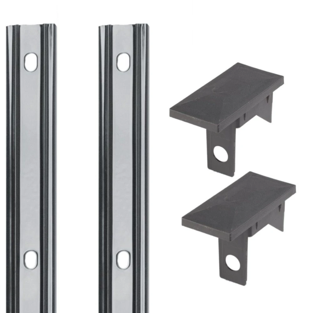 Abdeckleiste und Pfostenkappe (je 2 Stück) für den Zaunpfosten Typ P-Fix in der Farbe anthrazit. Die Abdeckleiste ist verzinkt und pulverbeschichtet, die Pfostenkappe aus Kunststoff. Die Abdeckleiste besitzt eine Länge von 800 mm und hat drei Befestigungspunkte. Die Abdeckleisten haben nach der Montage einen kleinen Überstand, der mit der mitgelieferten Pfostenkappe kaschiert wird.