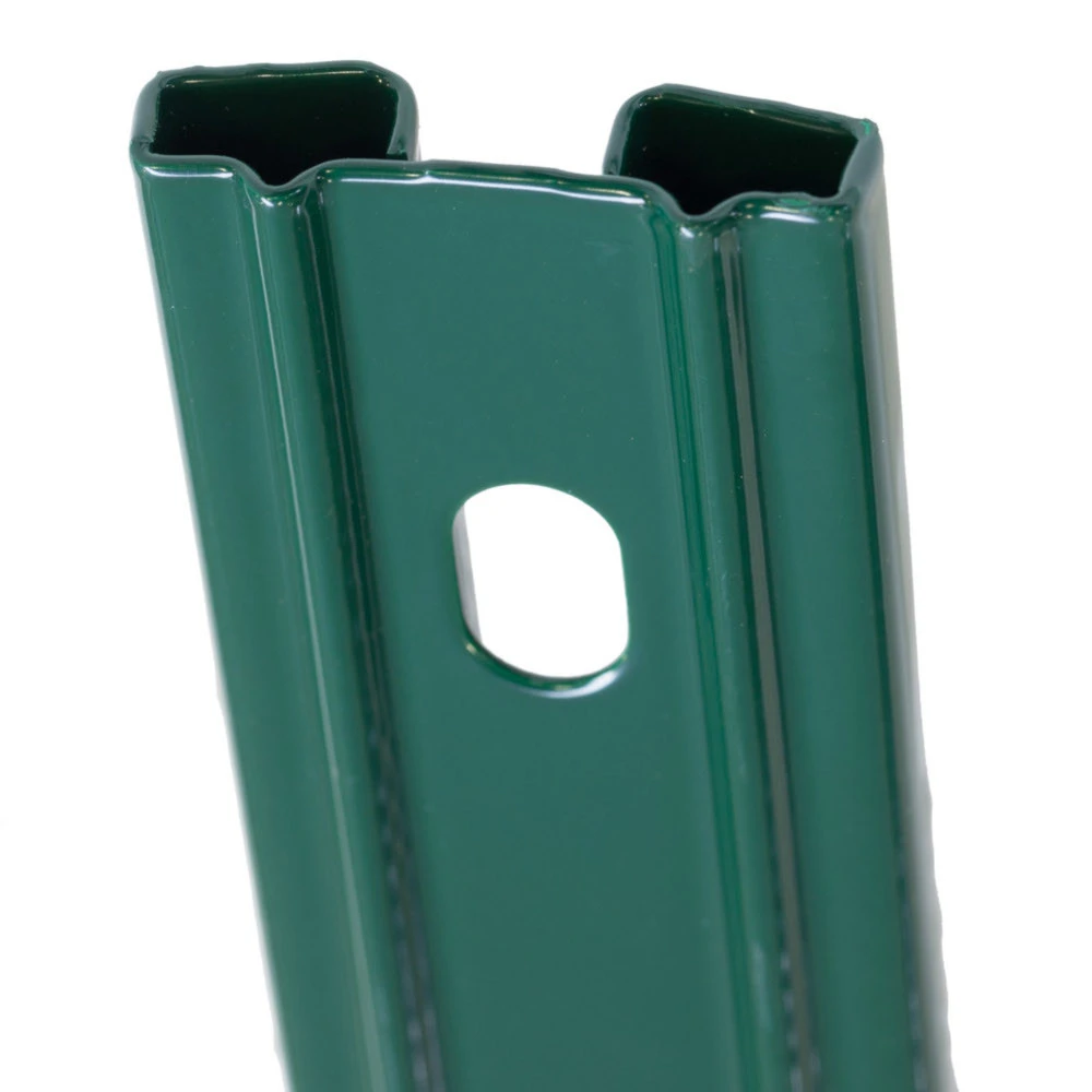 Abdeckleiste und Pfostenkappe (je 2 Stück) für den Zaunpfosten Typ P-Fix in der Farbe moosgrün. Die Abdeckleiste ist verzinkt und pulverbeschichtet, die Pfostenkappe aus Kunststoff. Die Abdeckleiste besitzt eine Länge von 1000 mm und hat vier Befestigungspunkte. Die Abdeckleisten haben nach der Montage einen kleinen Überstand, der mit der mitgelieferten Pfostenkappe kaschiert wird.