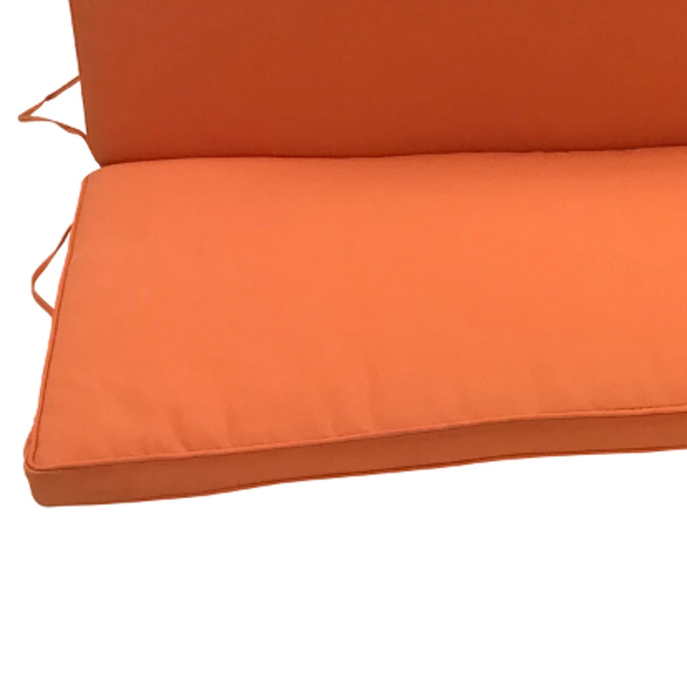 Universal – Auflage mit Rückenteil für 3-Sitzer Gartenbänke in der Farbe Terracotta. Die Sitzauflage ist bei 40°C waschbar. Die Auflage hat Bänder zum Befestigen (im Knick zwischen Sitz- und Rückenteil sowie oben am Rücken).