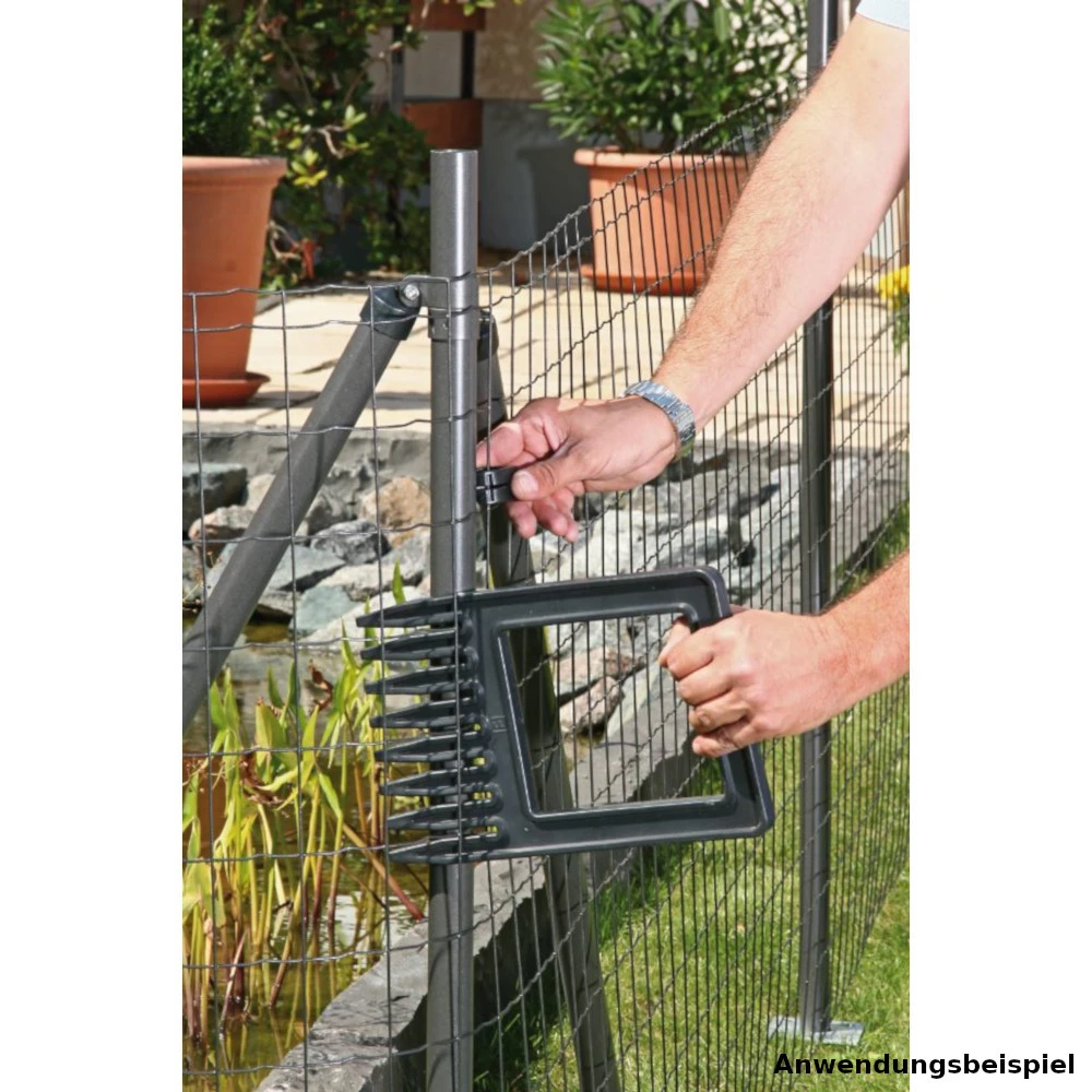 Im Lieferumfang ist unter anderem ein Spannkamm zur Straffung des Schweißgitters enthalten. Um das Schweißgitter zu spannen, wird der Spannkamm einfach durch eine Masche gesteckt und horizontal um den Pfosten gehebelt. Mit den Spannstiften auf der Rückseite kann die Feinspannung vorgenommen werden.
