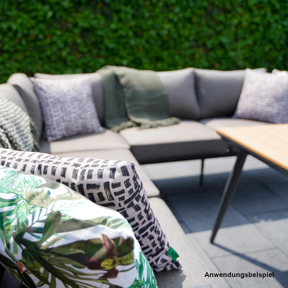 Das Eckbank-Set Dining Arezzo bietet Platz für bis 7 Personen. Aus pulverbeschichtetem Aluminium gefertigt, ist die Gartengarnitur langlebig, witterungsbeständig und leicht zu transportieren. Die Garten-Sitzgruppe besteht aus zwei Sofamodulen mit integriertem Seitentisch, einem Mittelmodul, einer Sitzbank und einem Lounge-Tisch in Teakholzoptik. Passend dazu werden Auflagen und bequeme Rückenkissen in grau mitgeliefert. Bei längerem Nichtgebrauch der Sitzgruppe ist es ratsam, die Kissen an einem trockenen und sauberen Ort zu lagern, zum Beispiel in einer Kissenbox.