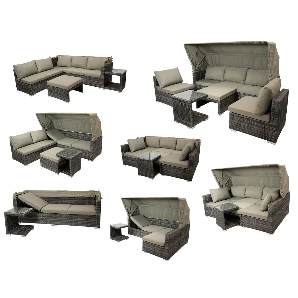 Die Elemente des Gartenmöbel-Sets sind auf vielfältige Weise kombinierbar. So können alle Elemente zusammengeschoben werden, das Set ist dann als Liege nutzbar. Auseinandergeschoben ergibt sich eine Sitzgruppe mit sechs Plätzen.
