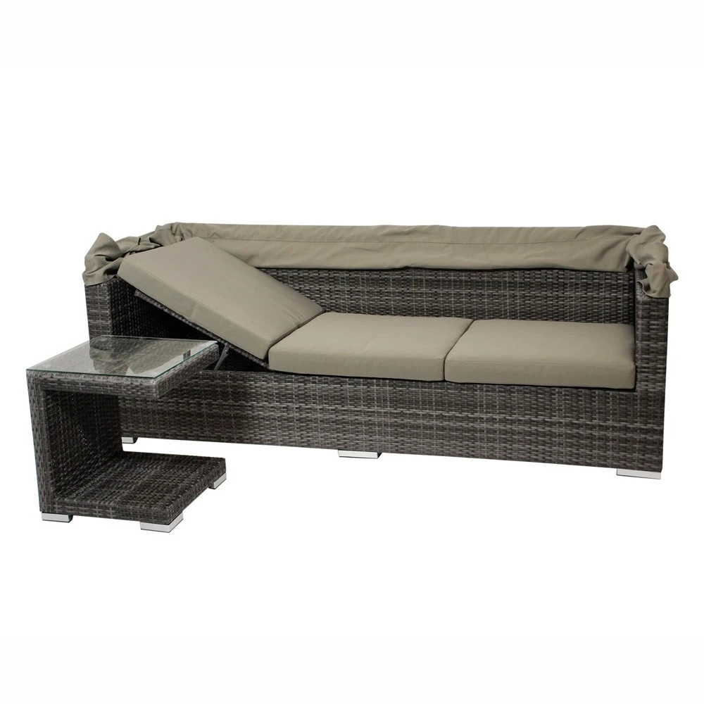 Das Sofa ist auch als Liege nutzbar, hierzu ist eine äußere Sitzfläche mehrfach in der Neigung verstellbar.