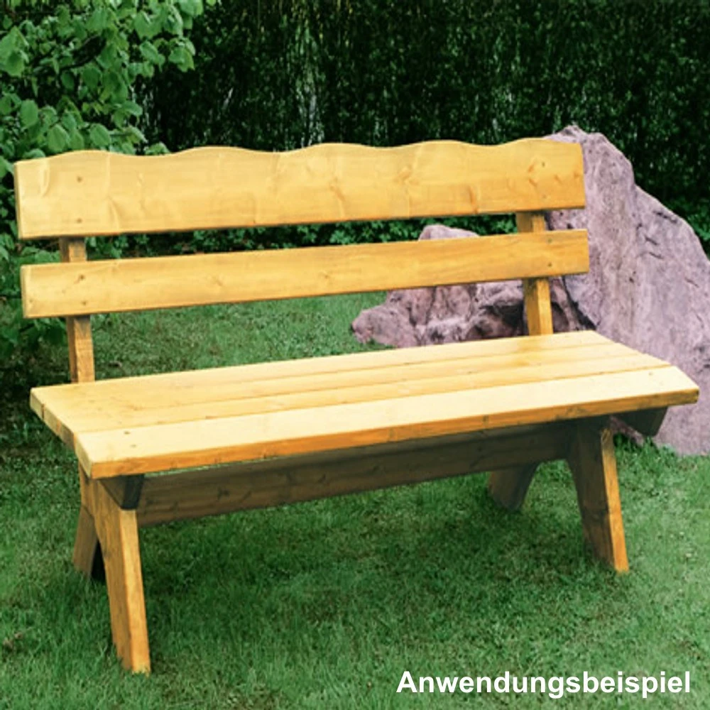 Diese pflegeleichte Gartenbank wurde aus massivem Kiefernholz mit einer Lattenstärke von ca. 35 mm gefertigt und damit äußerst stabil und robust. Durch die hellbraune Imprägnierung wird die natürliche Optik bewahrt. Da das Holz vor der Anwendung kammergetrocknet wurde, ist es besonders robust und witterungsbeständig. Dadurch ist die Bank gefestigt und stabil.