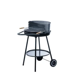 Der fahrbare Grillwagen El Toro lässt sich dank großen Rädern einfach und schnell an den richtigen Platz transportieren. Durch dem Grillrost mit Ø 47,5 cm Grillfläche hast du ausreichend Platz für deine Grillvariationen und dieser lässt sich in der Höhe 5-fach verstellen. Die Bodenfläche bietet Stauraum für Grillkohle. Ein echter Blickfang bei jeder Großveranstaltung, Gartenparty, oder Geburtstagsfeier. Inklusive eines Warmhalterostes.