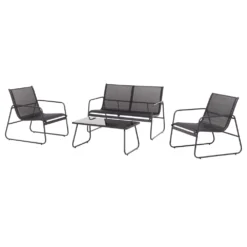 Das Lounge-Set mit Textil-Bespannung in schwarz bietet Platz für bis 4 Personen. Aus robustem Metall gefertigt, ist die Gartengarnitur langlebig, witterungsbeständig und leicht zu transportieren. Die Garten-Sitzgruppe besteht aus einer 2-Sitzer-Bank, einem Lounge-Tisch mit 5 mm dicker Glasplatte und zwei Gartenstühle.
