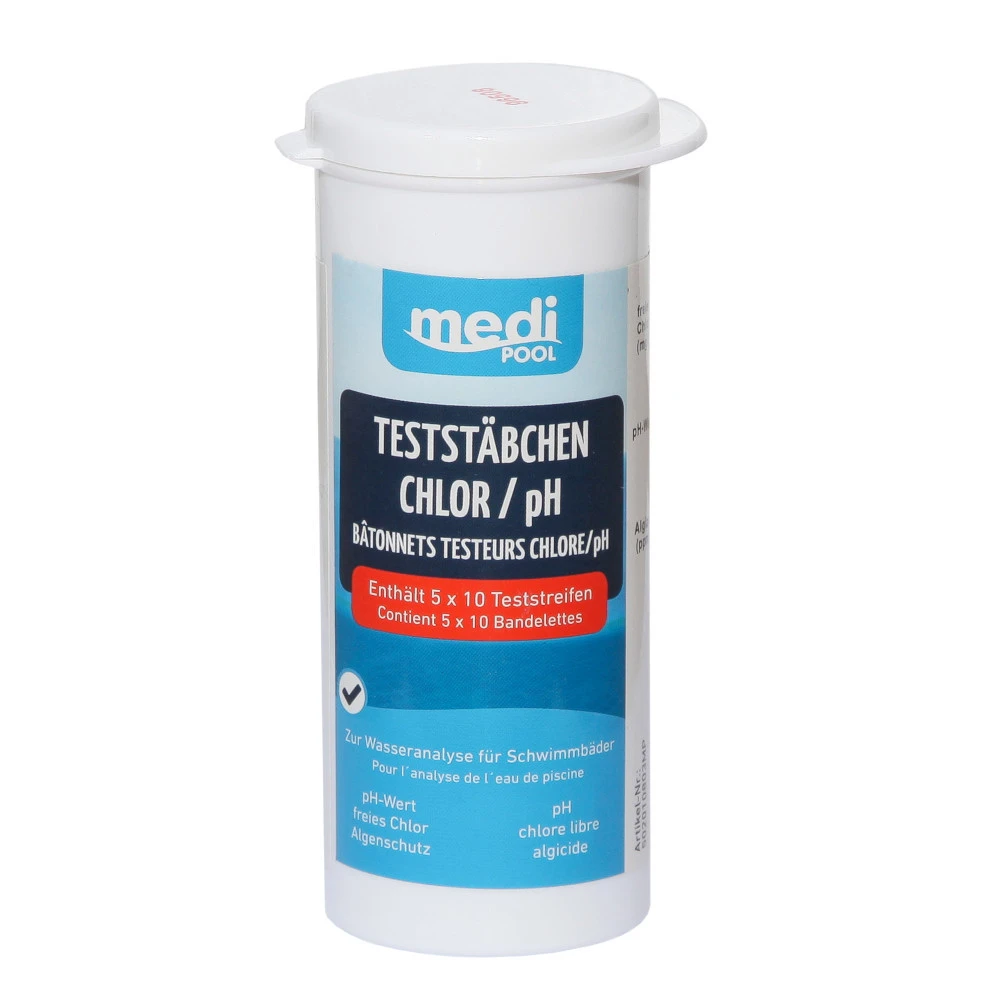 Medipool Test-Stäbchen für Pools, testet zuverlässig Chlor und pH-Werte. Zur sicheren Wasseranalyse von Schwimmdädern und Pools.