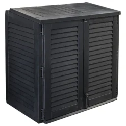 Die Mülltonnenbox aus schwarzem Kunststoff ist eine elegante Lösung, um zwei Müllbehälter bis 120 Liter zu verbergen. Die Box ist eine edle und individuelle Möglichkeit die unbeliebte Optik der Mülltonne zu verstecken. Ihre ansprechende Optik sorgt für eine saubere Lösung vor dem Haus. In der Box ist eine Kette befestigt, die innen den Deckel der Mülltonne anhebt, wenn außen der Deckel der Box geöffnet wird. Eine Vorrichtung für ein Vorhängeschloss verhindert ein ungewolltes Entsorgen von fremdem Müll.