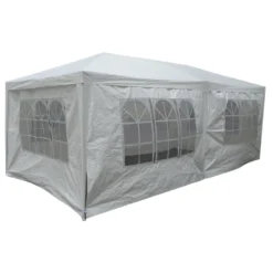 Der große Pavillon, bestehend aus sechs Seitenteilen mit Sichtfenster, eignet sich für Gartenpartys, kleinere Veranstaltungen oder Flohmärkte. Dank des einfachen Aufbaues lässt sich das Zelt im Handumdrehen aufstellen und bietet optimalen Sonnenschutz und Überdachung bei schlechtem Wetter. Sein robustes, pulverbeschichtete Stahlrohrgestell sorgt für die notwendige Stabilität. Geliefert wird das Partyzelt zerlegt und lässt sich bei Nichtgebrauch platzsparend aufbewahren.