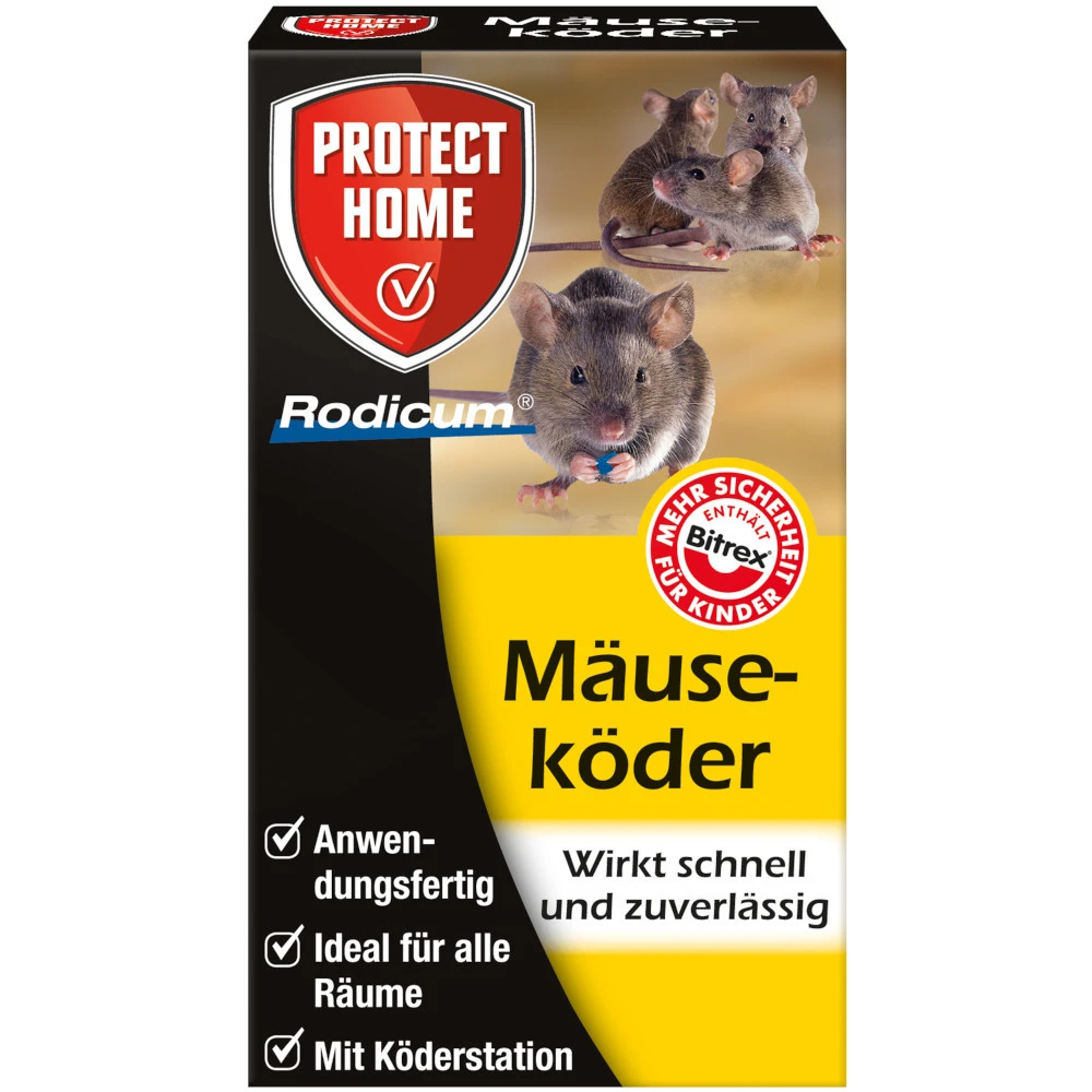 Der Protect Home Mäuseköder ist ideal zur Anwendung gegen Mäusebefall in Gebäuden bzw. Innenräumen geeignet. Er zeichnet sich durch einen schnellen Wirkungseintritt aus. Der anwendungsfertige Köder enthält den Wirkstoff Chloralose, ein schnell wirksames Narkotikum. Für mehr Sicherheit für Kinder enthält der Köder den Bitterstoff Bitrex. Die Anwendung ist ganzjährig möglich. Die Mäuseköderbox im Abstand von maximal 3 m entfernt aufstellen. Je nach Befallsstärke mehrere Köderboxen um das Nest platzieren.