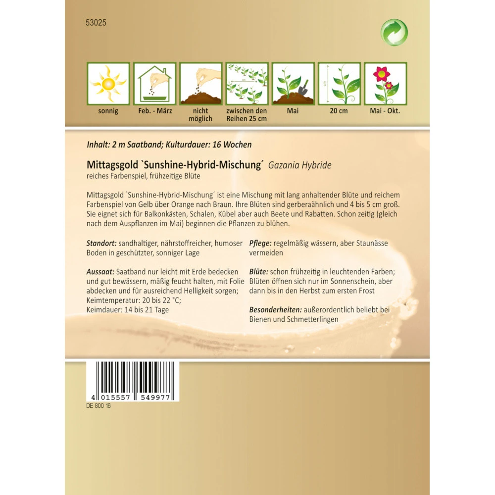 Mittagsgold Sunshine-Hybrid-Mischung ist eine Mischung mit lang anhaltender Blüte und reichem Farbenspiel von Gelb über Orange nach Braun. Ihre Blüten sind gerberaähnlich und 4 bis 5 cm groß. Sie eignet sich für Balkonkästen, Schalen, Kübel, aber auch Beete und Rabatten. Schon zeitig (gleich nach dem Auspflanzen im Mai) beginnen die Pflanzen zu blühen.