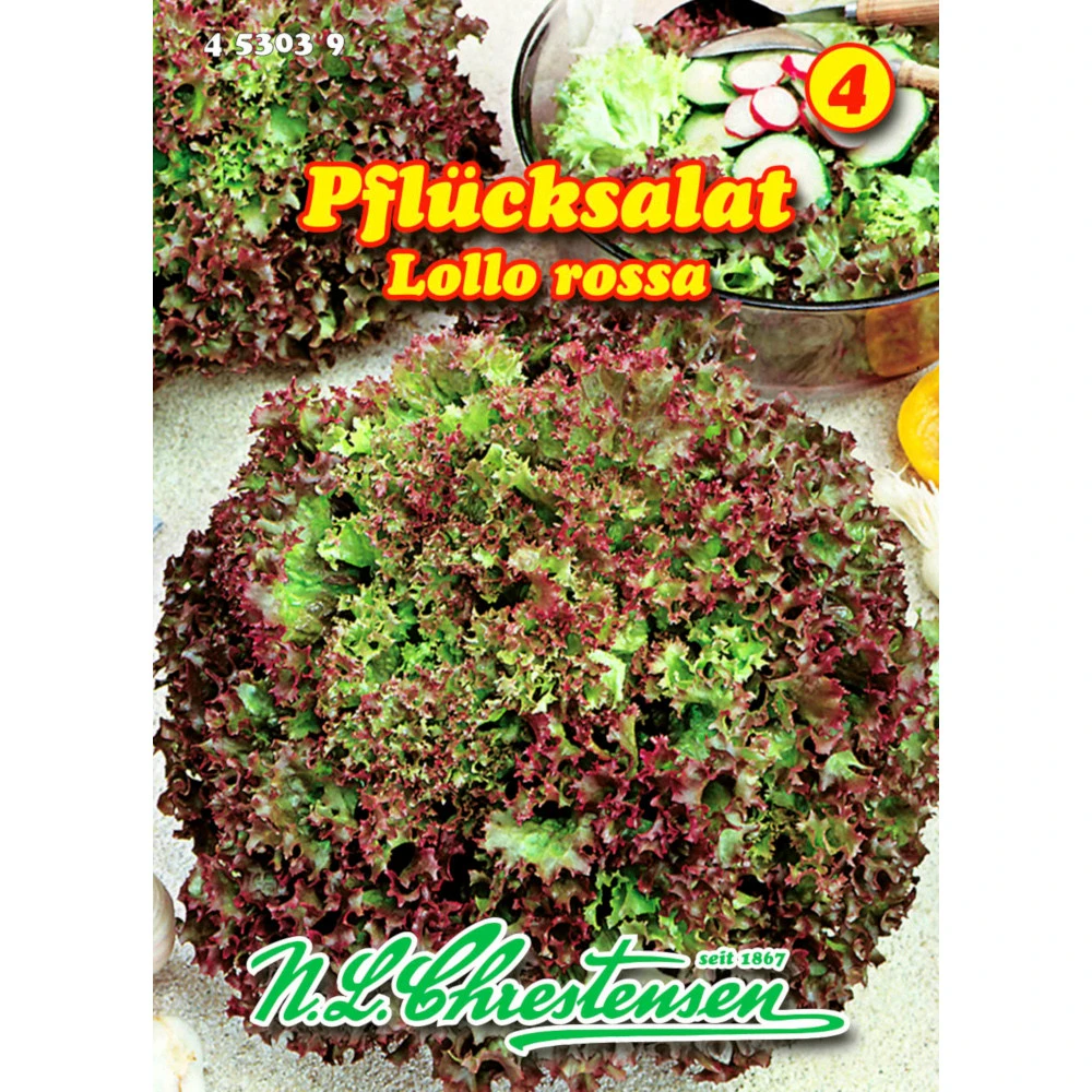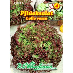 Der Pflücksalat Lollo Rossan mit gekräuselten, dickfleischigen Blättern mit breiten, roten Rändern ist eine Salatsorte für den Anbau im Frühjahr bis zum Herbst. Seine gute Schossfestigkeit zeichnet den Salat aus. Somit eignet sich das Gemüse ideal zur Verfeinerung von Salaten, zum Frischverzehr oder zur Garnierung.