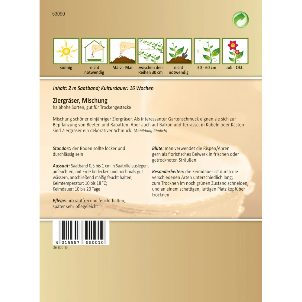 Mischung schöner einjähriger Ziergräser. Als interessanter Gartenschmuck eignen sie sich zur Bepflanzung von Beeten und Rabatten. Aber auch auf Balkon und Terrasse, in Kübeln oder Kästen sind Ziergräser ein dekorativer Schmuck.