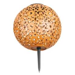 Die Solarlampe aus Metall hat einen rostigen Stil und eignet sich sowohl als Tischlampe als auch als Stehlampe. Die Kugel verfügt über einen ON/OFF-Schalter sowie einen Erdspieß.