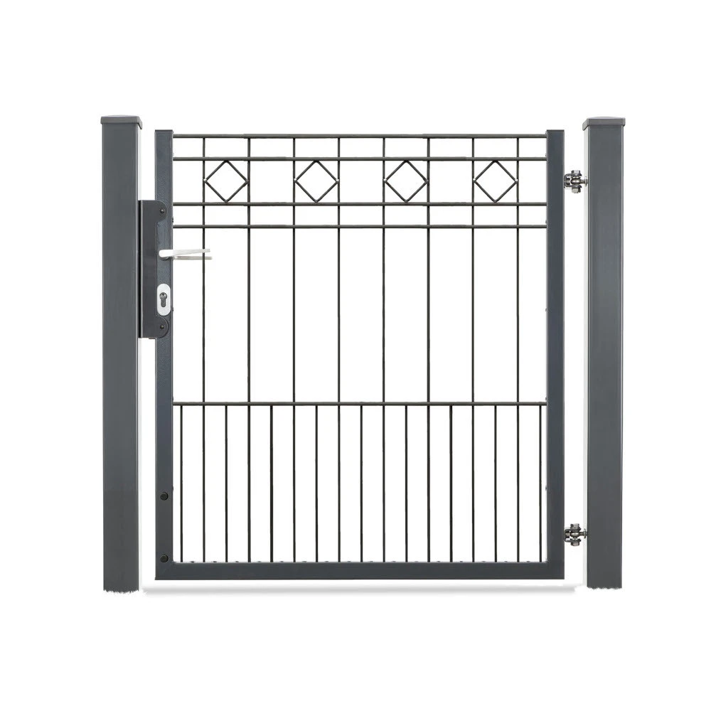 Einflügeliges Drehflügeltor „TURIN“ aus Doppelstabgitter, passend zum Komplett-Zaun Turin. Das Tor besticht durch seine Eleganz und die besonderen klassischen Rauten-Ornamente, die ihm eine ansprechende Optik und eine hohe Formstabilität geben. Verzinkung und hochwertige Pulverbeschichtung garantieren eine außerordentlich lange Lebensdauer. Die Öffnungsrichtung lässt sich durch die entsprechende Pfostenmontage nach links oder nach rechts bestimmen. Bitte die abweichende Lichte Weite beachten bei veschiedenen Öffnungsrichtungen (90° oder 180° siehe weiter unten). In der Farbe anthrazit.